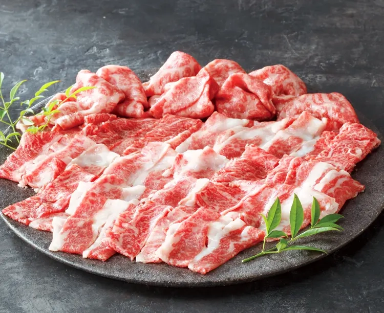格付けだけではなく、血統や生産者、キメの細かさや色、肉質などで見極めた黒毛和牛。脂の融点が低いメス牛のみを使用しているので、脂乗りと甘みは別格です。今回はモモ・肩・バラを組み合わせスライスしている切り落としのため、色々な部位の味をお楽しみいただけます。