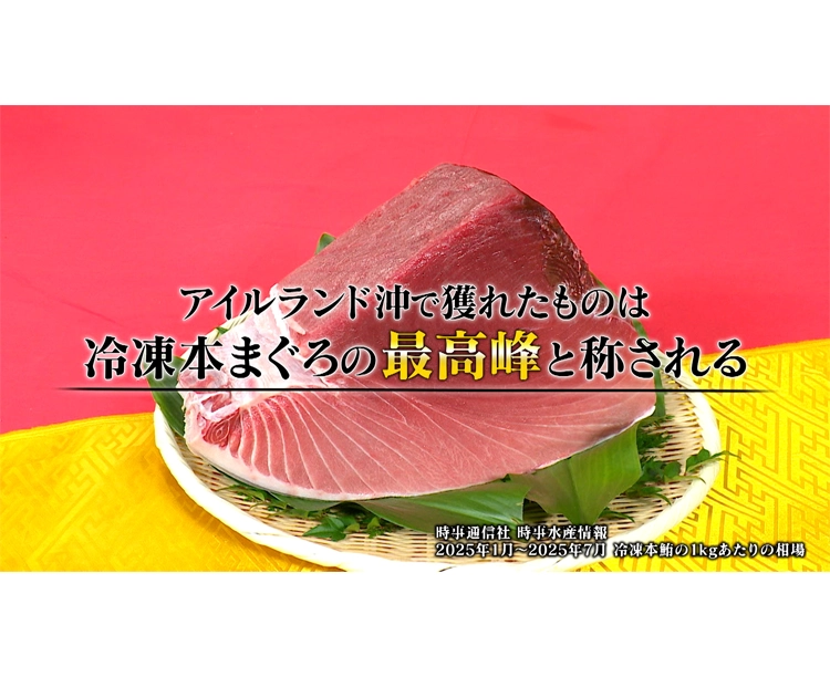 今回の天然本まぐろは、高品質といわれるアイルランド沖のものに限定。さらに、100kg以上のものを使用し、旬と言われる脂乗りの良い時期の天然本まぐろは、プロも絶賛する逸品です。