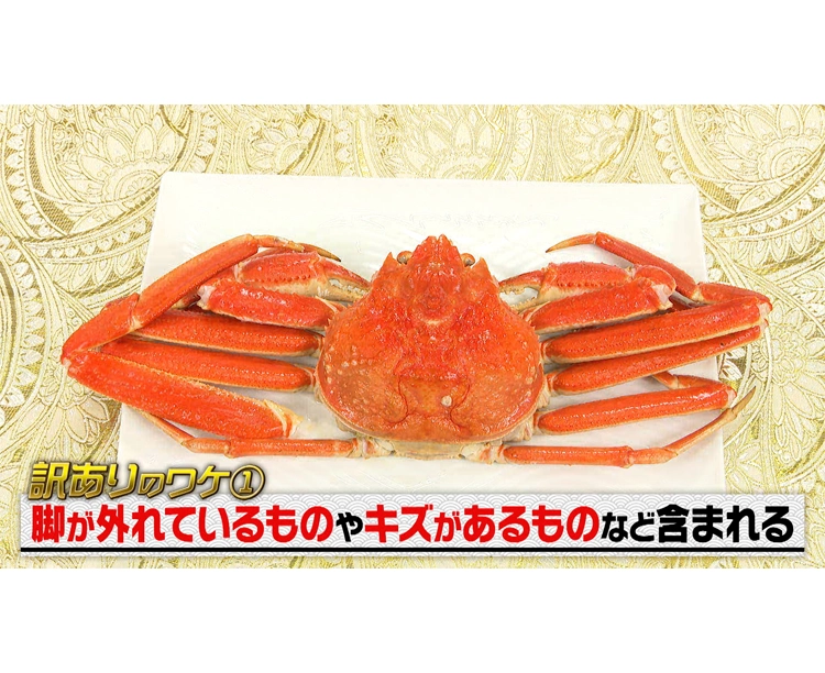 訳ありのワケ①・・・茹でる際に驚き脚を切り離してしまうことや、作業中に脚が外れてしまうこともあります。そのようなカニに脚を足し1尾にして凍結したものや、甲羅などの色味やキズがあるものなどが含まれます。