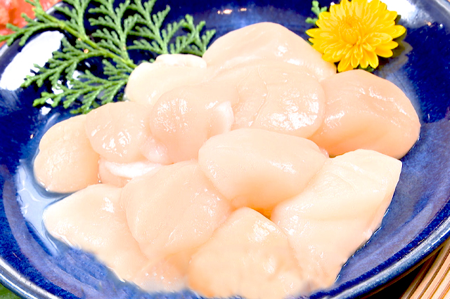 まずはシンプルにお刺身で北海道の天然ほたての味をお楽しみください。弾力がありながらも、身はやわらかく、豊かな旨味とほのかな磯の香りが広がります。