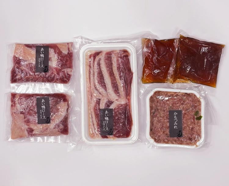 - あい鴨ローススライス150g、あい鴨もも肉カット100g×2、あい鴨つみれ120g、醤油つゆ 70ml×2パック